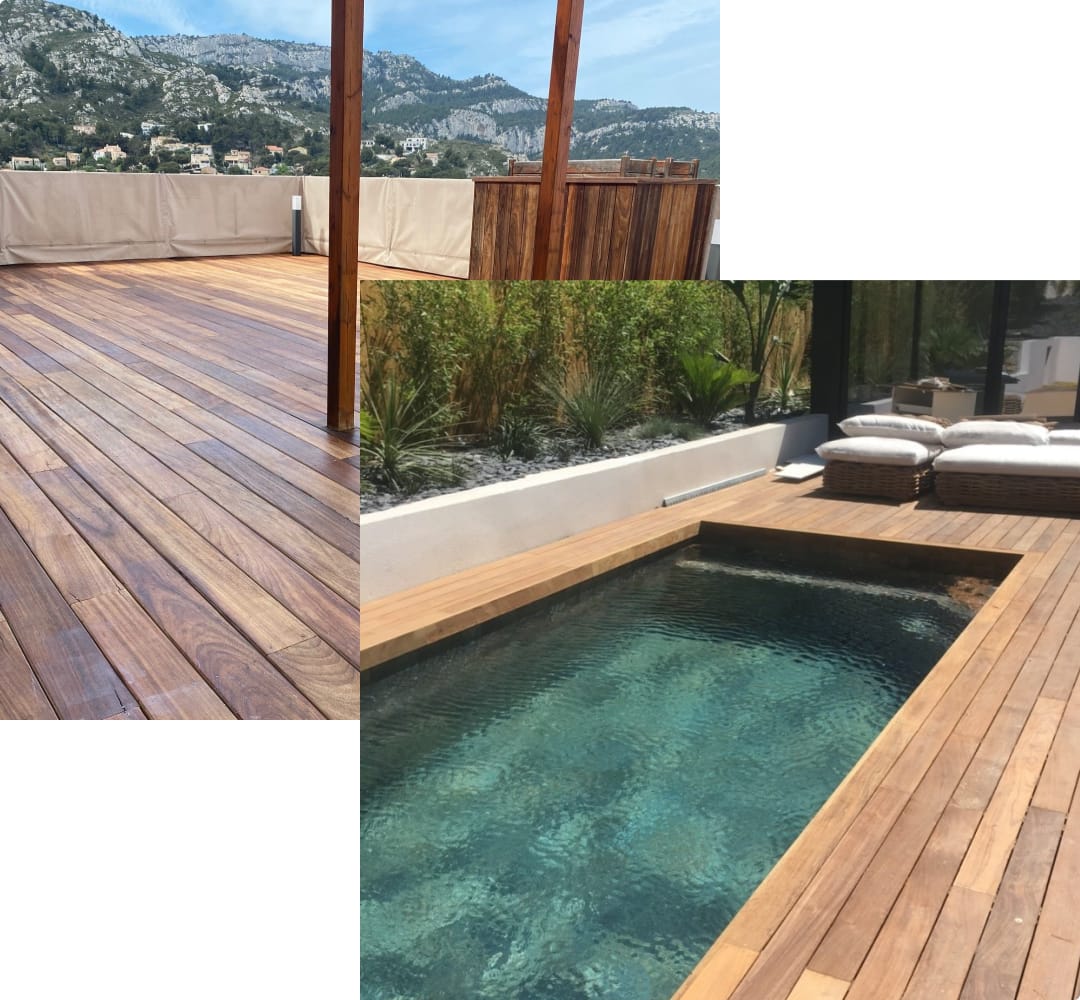 Oui. Le bois est particulièrement apprécié autour des piscines pour son confort de marche et son aspect naturel. La pose et les finitions sont adaptées pour garantir sécurité et durabilité.
