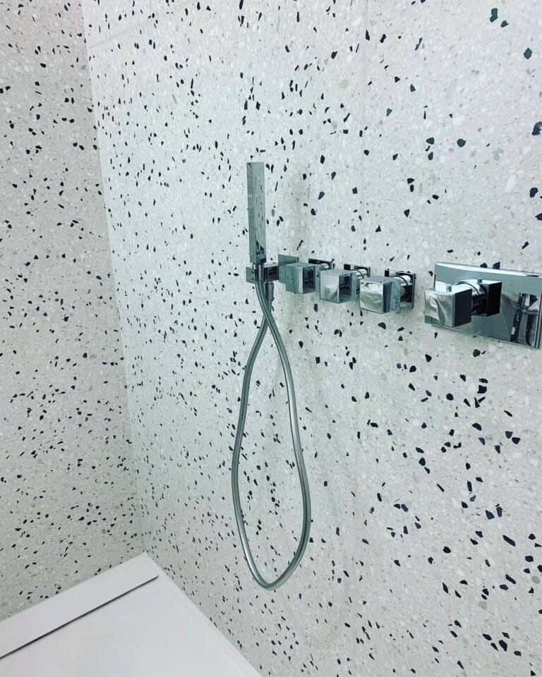 Habillage d’ un mur de salle de bain en terrazzo à Aix en Provence dans les bouches du Rhône